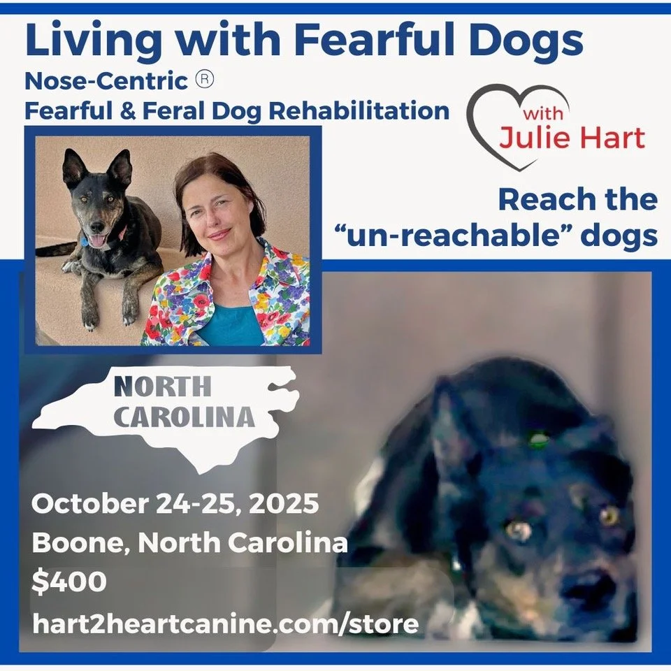 This workshop is ideal for dog trainers, shelter staff, and dog rescuers. Many fearful dog parents have attended Julie’s workshops and found great value for helping their own dogs.